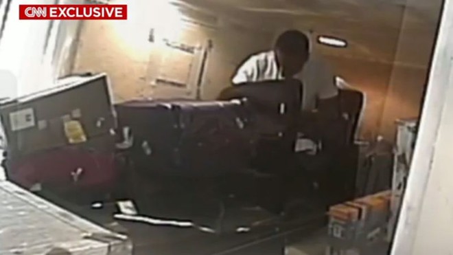 Camera bí mật ghi lại cảnh nhân viên tại sân bay quốc tế Miami ở Mỹ lấy trộm đồ đạc của hành khách. Ảnh: CNN