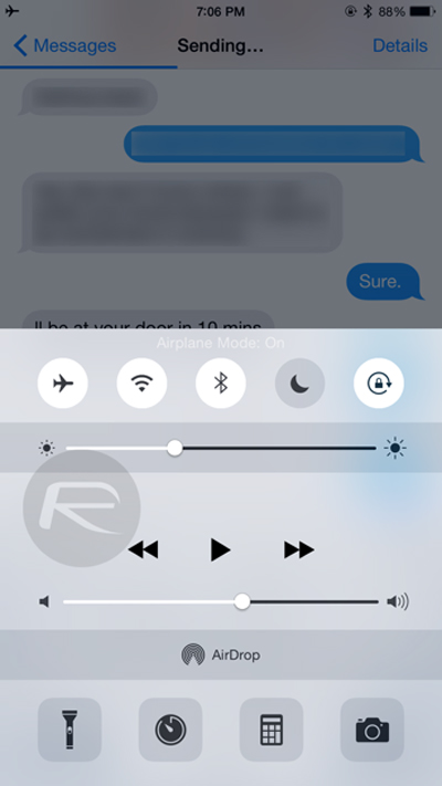 Nhanh chóng bấm vào tuỳ chọn Airplane mode, ngay lập tức sóng điện thoại và Wi-Fi đều bị đóng. Như vậy, tin nhắn dạng SMS hoặc iMessage đều sẽ chuyển sang trạng thái bị huỷ.