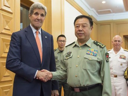 Tướng Phạm Trường Long (phải) và Ngoại trưởng Mỹ John Kerry trong một cuộc gặp hồi tháng Ba