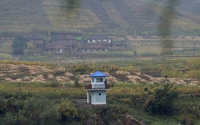 Binh lính Triều Tiên đứng gác tại một trạm gác trên sông Yalu gần thành phố Hyesan.