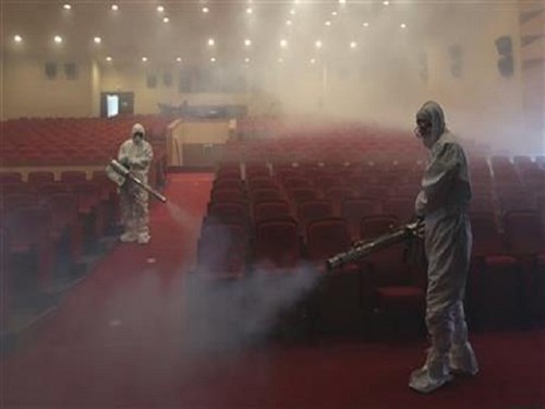 Nhân viên y tế đang phun thuốc khử trùng ngăn ngừa sự lây lan của MERS