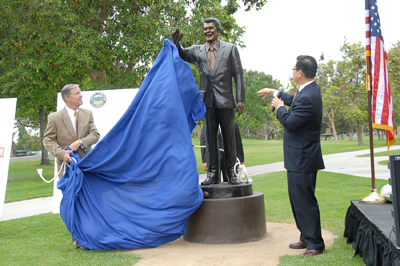 Giám Sát Viên Andrew Đỗ (phải) cùng cựu Dân Biểu Chris Cox (trái) kéo màn, khánh thành bức tượng Tổng Thống Ronald Reagan.