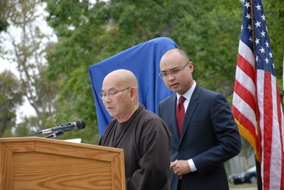 Trước hàng trăm cư dân và các đại diện dân cử, Giám Sát Viên Andrew Đỗ cùng cựu Dân Biểu Chris Cox, từng phục vụ trong chính quyền Reagan, vén tấm màn xanh, khánh thành bức tượng đồng cao 6.7 ft, giữa tiếng vỗ tay vang dội của mọi người. Ông cám ơn mọi người góp công thực hiện dự án.