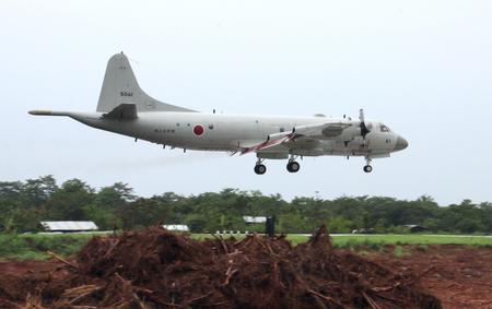 Chiếc máy bay săn ngầm P-3C chở theo 20 nhân viên quân sự Nhật bản hạ cánh tại sân bay Puerto Princesa hôm 21-6. Ảnh: Kyodo