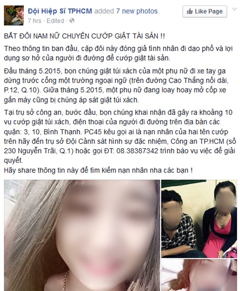 Ngày 4/7, trang fanpage Đội hiệp sĩ TP.HCM đã đăng tải thông tin này của hai đối tượng để những ai từng là nạn nhân có thể vào nhận diện và trình báo với cơ quan điều tra để giải quyết vụ việc.