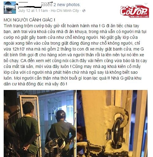 Mới đây, facebooker T.G đã đăng tải thông tin nhà mình bị trộm khiến cộng đồng mạng phát hoảng vì độ táo tợn của bọn trộm cướp. Theo lời kể của chị thì khi đó khoảng vừa hơn 12:10 đêm 12/7, trong nhà vẫn có nguời nhưng đa số đều ra ngoài đi ăn tiệc nên đã khóa cửa ngoài băng ống khóa chắc chắn.