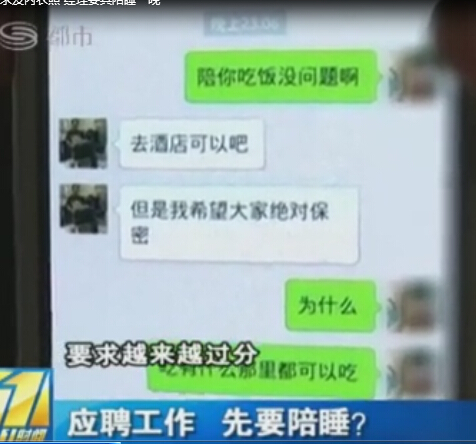 Một công ty tại Trung Quốc có nhu cầu tuyển dụng nhân viên tiếp thị, nhưng khi đọc yêu cầu tuyển dụng thì các cô phát hoảng vì họ yêu cầu ứng viên phải gửi ảnh nhạy cảm, thậm chí phải "cùng chăn gối với sếp" mới được vào công ty thay cho việc nộp CV và phỏng vấn.
