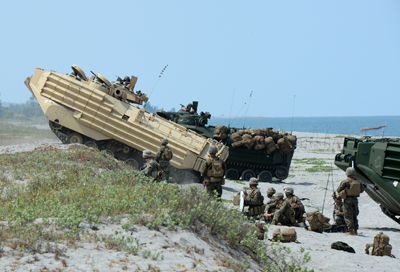 Một đơn vị TQLC Mỹ bắt đầu vào vị trí tập trận ngày 21 Tháng Tư, 2015 trên bờ biển Phi Luật Tân đối diện với bãi cạn Scarbourough đang tranh chấp giữa Phi và Trung Quốc. (Hình: Ted Aljibe/AFP/Getty Images)