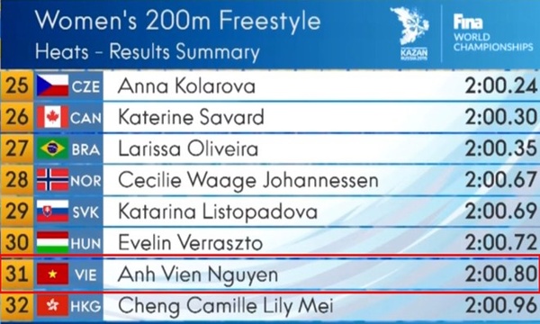 Phải thi đấu giữa một dàn "thứ dữ" của thế giới, Ánh Viên đã không thể thể hiện hết được những phẩm chất tốt nhất của mình ở nội dung sở trường 200m tự do. Ánh Viên về thứ 10 lượt bơi thứ 5 với thành tích 2 phút 00 giây 80. Trong khi về nhất là vận động viên người Mỹ Ledecky Katie với thành tích 1 phút 55 giây 82. Kết quả của Ánh Viên tại giải vô địch thế giới thậm chí kém hơn thành tích cô đạt được tại SEA Games 28 (1 phút 59 giây 27). Kình ngư người Cần Thơ đứng thứ 31 trong tổng số 63 vận động viên tham dự vòng loại nội dung 200 m tự do nữ.