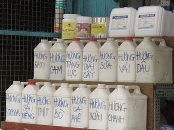 Đứng từ bên ngoài cửa hàng quan sát vào, chúng tôi có thể dễ dàng nhìn thấy được vô số can nhựa cỡ 1-2 lít được đặt trên các kệ hàng không có nhãn mác, nhưng bên ngoài có ghi dòng chữ: hương sầu riêng, hương dâu, hương vải,... đó là những loại hóa chất để tạo hương vị cho trà sữa theo đúng mùi yêu cầu của khách. Thấy chúng tôi đứng quan sát lâu, một người đàn ông khoảng 30 tuổi ra hỏi bán hàng.