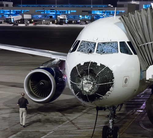 Một máy bay vừa cất cánh được không lâu thì gặp trận mưa đá to khủng khiếp gây thiệt hại lớn. Phần đầu của máy bay gần như nát bươm. Theo được biết, đá trong trận mưa đá nàyto như quả bóng chày… Thật là kinh khủng