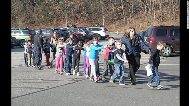 Các em học sinh được sơ tán khi xảy ra vụ xả súng kinh hoàng tại trường tiểu học Snady Hook khiến 20 em học sinh và 6 người lớn thiệt mạng.