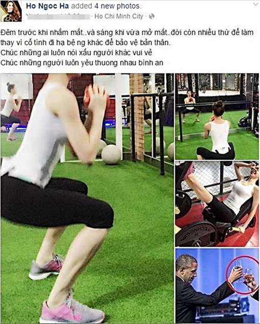 Không lâu sau khi bị chê bai, Hồ Ngọc Hà đăng tải ảnh Tổng thống Mỹ Barack Obama cầm ly rượu lúc tiếp khách để phản pháo. Kèm theo ảnh được khoanh tṛn đỏ cách cầm ly của hai chính trị gia, cô viết: "Đêm trước khi nhắm mắt... và sáng khi vừa mở mắt... đời c̣n nhiều thứ để làm thay v́ cố t́nh đi hạ bệ người khác để bảo vệ bản thân. Chúc những ai luôn nói xấu người khác vui vẻ. Chúc những người luôn yêu thương nhau b́nh an".