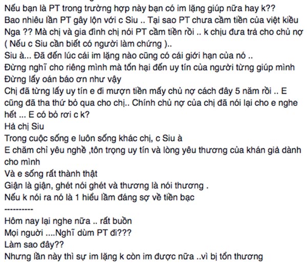 Bao nhiêu lần Phương Thanh gây lộn với chị Siu tại sao Phương Thanh chưa cầm tiền của Việt kiều Nga mà chị và gia đình chị nói Phương Thanh cầm tiền rồi không chịu đưa trả cho chủ nợ (nếu chị Siu cần biết có người làm chứng).