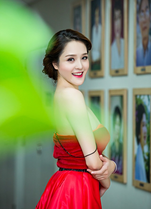 Cô chọn bộ đầm đỏ trễ nải của nhà thiết kế Hà Duy, tôn lên làn da trắng cùng vòng 1 gợi cảm.