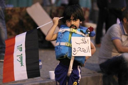 Một bé trai Iraq mặc áo phao với dòng chữ "Tôi muốn di cư" trong cuộc biểu tình chống tham nhũng ở Baghdad ngày 11/9. Ảnh: AFP