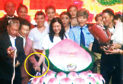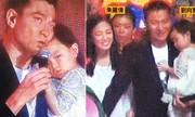 Năm nay, ngoài bố mẹ, Lưu Đức Hoa đưa cả vợ con tới dự sinh nhật. Đây là lần đầu Chu Lệ Thiên lên sân khấu cùng chồng. Cô bé Lưu Hướng Huệ trong vòng tay bố, tỏ ra e ngại vì đông người.