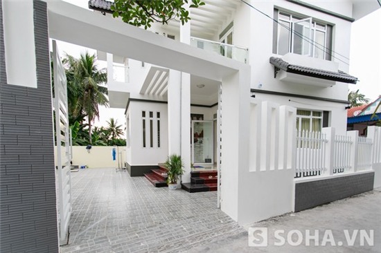 Căn nhà 2 tầng với thiết kế sang trọng, hiện đại nổi bật với màu trắng bắt mắt. Ngôi nhà này khác biệt hoàn toàn với những căn nhà cũ kỹ, thấp bé xung quanh.