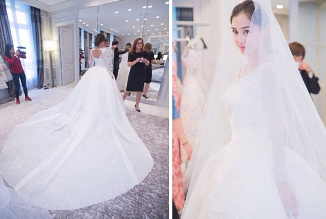 Đám cưới của Angelababy cùng Huỳnh Hiểu Minh tổ chức hôm 8/10 ở Thượng Hải, Trung Quốc. Chiếc váy cưới cho ngày trọng đại được người đẹp đặt may tại Pháp.