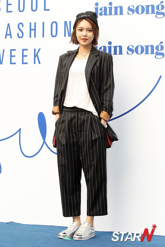 Cùng xuất hiện tại show diễn Jain Song cùng với Park Shin Hye nhưng Sooyoung (SNSD) lại thể hiện gout thời trang cá tính của mình với bộ cánh đậm chất menswear vô cùng phóng khoáng và bụi bặm. Sooyoung kết hợp bộ suit kẻ sọc với giày sneaker màu bạc và mũ len hết sức "cool ngầu". Vốn sở hữu vóc dáng thanh mảnh cùng chiều cao lý tưởng nên Sooyoung dễ dàng mặc đẹp nhiều kiểu trang phục trong đó có bộ suit dễ "dìm dáng" như thế này.