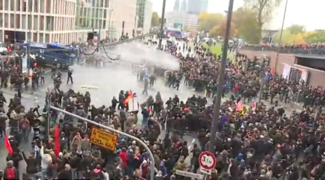 Tại Colgne, theo Reuters, cảnh sát cho biết ẩu đả nổ ra giữa cảnh sát và những người biểu tình cực đoan cánh tả trước khi cảnh sát bật vòi rồng lên để đàn áp.