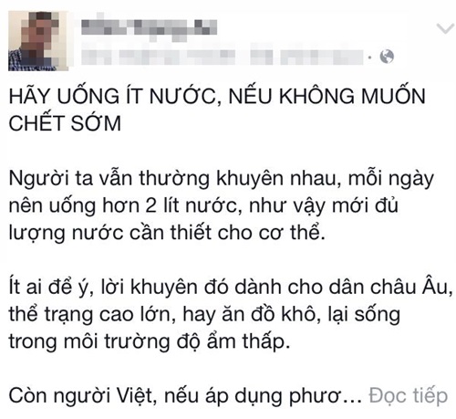 Theo đó Nickname T.A chia sẻ rằng: "người ta vẫn thường khuyên nhau, mỗi ngày nên uống hơn 2 lít nước, như vậy mới đủ lượng nước cần thiết cho cơ thể. Tuy nhiên lời khuyên này chỉ dành cho người Châu Âu, thể trạng cao lớn, hay ăn đồ khô, lại sống trong môi trường độ ẩm thấp, còn với người Việt, nếu uống nhiều nước sẽ gây hại não, nội tạng".