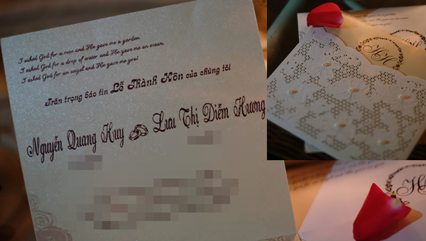 Một người bạn cho biết, thiệp cưới được chính vợ chồng Diễm Hương lên ý tưởng thực hiện, dồn rất nhiều tâm huyết. Hoa hậu còn đích thân ngồi giám sát chi tiết in cắt laser mềm mại, độc đáo trên thiệp.