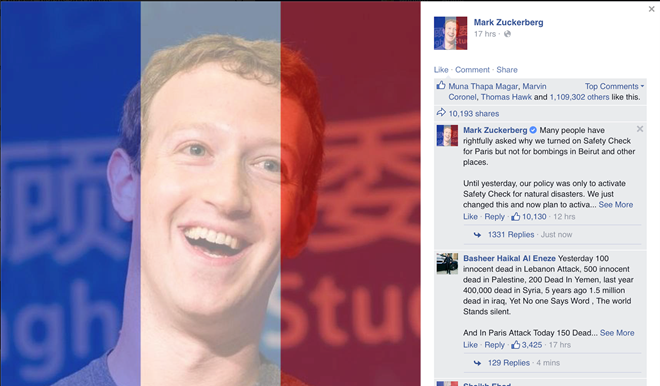 Phản hồi những ý kiến trên, Mark Zuckerberg cho rằng người dùng có quyền chất vấn vì sao Facebook bật tính năng Safety Check cho những người ở Pháp nhưng không phải những trận bom ở Beirut hay nhiều nơi khác.