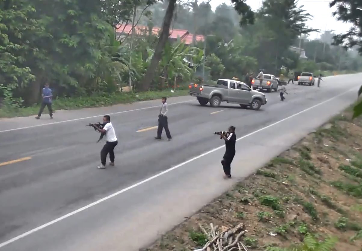 VBF-Clip ghi lại hình ảnh 4 người công an Thái Lan đang đi tuần bằng xe máy thì bất ngờ bị 3 chiếc ô tô chặn lại và nổ súng. Vụ tấn công rất nhanh khiến cho 4 cảnh sát chết tại chỗ. Hiện cơ quan điều tra vẫn đang tiếp tục tuy tìm nhóm hung thủ gây ra thảm sát này.