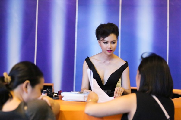 Đinh Ngọc Diệp tươi tắn trong hậu trường. Nữ MC thu hút mọi ánh nhìn với chiếc đầm khoét sâu phần cổ.