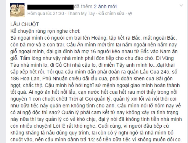 “Ai ngờ ăn hết nồi lẩu, cạn nước hết cua hết rau mới thấy trong nồi nguyên một con chuột chết! Trời ạ! Quản lý xin lỗi và nói thôi coi như bữa tiệc này quán em không tính cho anh. Cậu mình nói lỡ hôm nay về có ai ngộ độc thì sao? Quản lý phải cam kết từ nay không xảy ra tình trạng này nữa thì tay quản lý có vẻ khó chịu. Đại ý nói đã không tính tiền nhà mình còn nhiều chuyện”, cô Tranh viết.