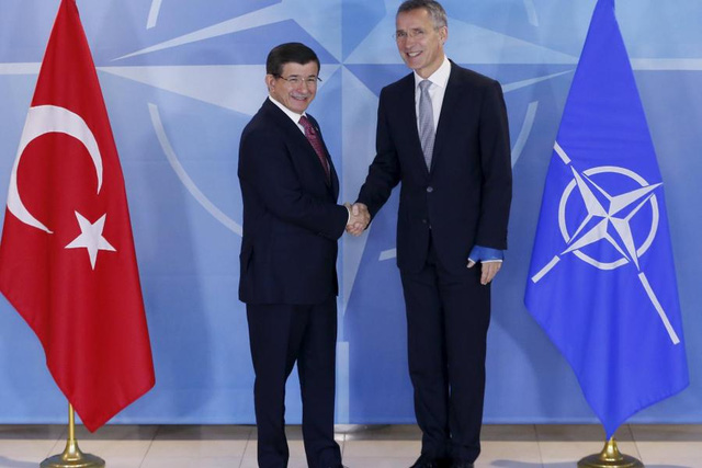 Thủ tướng Thổ Nhĩ Kỳ Ahmet Davutoglu (trái) và Tổng thư Ký NATO Jens Stoltenberg. Ảnh: Reuters