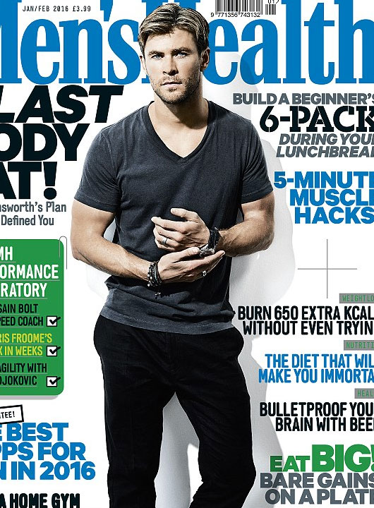 Chris Hemsworth bảnh bao và quyến rũ trên tạp chí Men's Health, số tháng 12/2015.