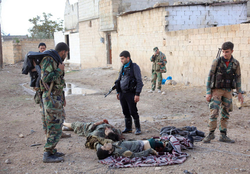 Lực lượng ủng hộ Chính phủ Syria bên thi thể các tay súng được cho là phiến quân IS tại thị trấn Safireh. Ảnh: AFP/TTXVN