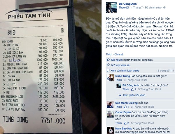 Đầu tháng 7 vừa qua, thành viên Bồ Công Anh trên facebook cá nhân chia sẻ, gia đình anh đi ăn ở quán Hoàng Y. trên đường Nguyễn Quang Diệu (Quận 3, TP.HCM). Đến khi tính tiền, cả nhà khá bất ngờ bởi trong hóa đơn tạm tính ghi nghêu và sò giá 219.000 đồng/đĩa, trái cây tính riêng từng thứ. Đặc biệt, nhà hàng tính thêm cả gia vị bếp nấu 190.000 đồng.