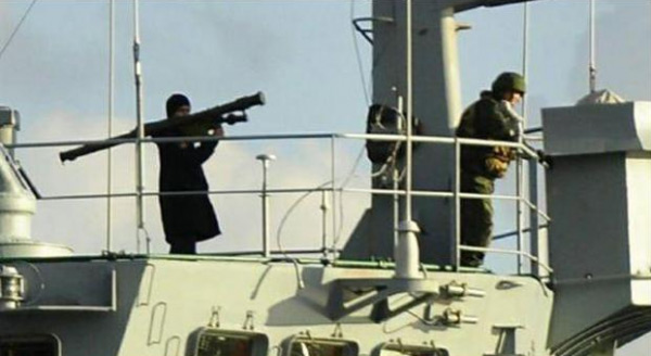 Những hình ảnh được truyền thông Thổ Nhĩ Kỳ đăng tải cho thấy, một người Nga đặt thiết bị phóng trên vai khi đang đứng trên boong tàu.
