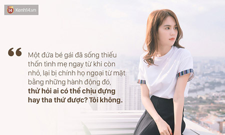 Một đứa bé gái đă sống thiếu thốn t́nh mẹ ngay từ khi c̣n nhỏ, lại bị chính họ ngoại từ mặt bằng những hành động đó, thử hỏi ai có thể chịu đựng hay tha thứ được? Tôi không. Người ta đối với tôi thế nào tôi đáp lại như vậy. Tôi chỉ không giúp đúng như điều năm xưa họ từng làm với ḿnh, chứ đâu kiếm chuyện hại họ thêm mà bảo tôi ác?