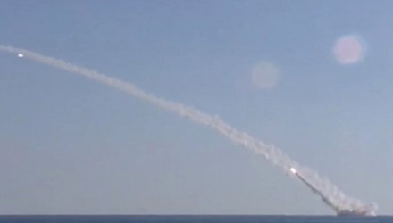 Tên lửa hành tŕnh Nga phóng lên từ tàu ngầm Rostov-on-Don. Ảnh: RT.