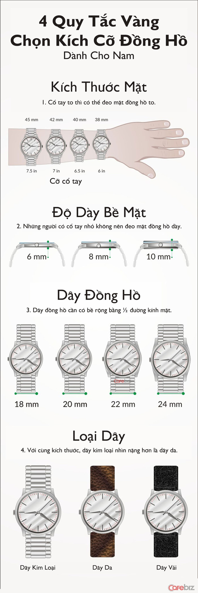 Với một chiếc đồng hồ được sản xuất đúng tỉ lệ, dây đeo sẽ có độ rộng bằng ½ kích thước mặt.
