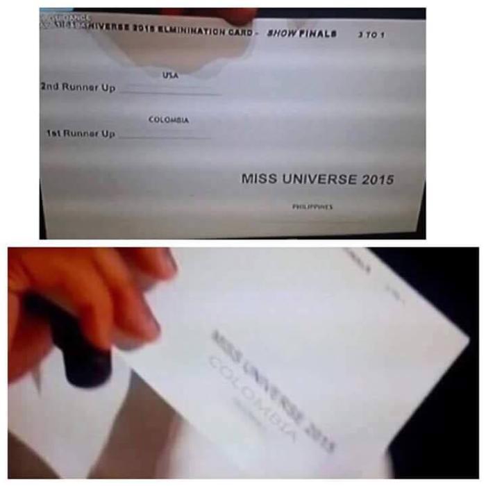 Sau khi kết thúc đêm Chung kết không bao lâu, một thông tin về thật hư kết quả chính thức trong đêm Chung kết Miss Universe 2015. Một bức ảnh được cho là kết quả chính thức in tên đại diện Colombia ở vị trí Miss Universe 2015, cho thấy kết quả ban đầu là chính xác, còn việc thay đổi vị trí được cho là BTC đã "tráo" kết quả vào phút cuối.
