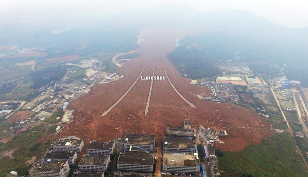 Ngày 20/12/2015, khối đất đá trượt xuống và phá hủy các tòa nhà trong khu vực sau một trận mưa. Liu Qingsheng, quan chức của thành phố Thâm Quyến, cho hay lở đất bao trùm một khu vực rộng lớn lên đến 380.000 m2, tương đương khoảng 60 sân bóng, và tại nhiều khu vực, bùn đất dày hơn 10 m. 22 tòa nhà bị chôn vùi, trong đó có hai ký túc xá dành cho công nhân. Ảnh: New York Times