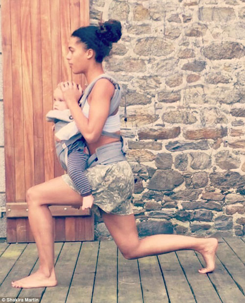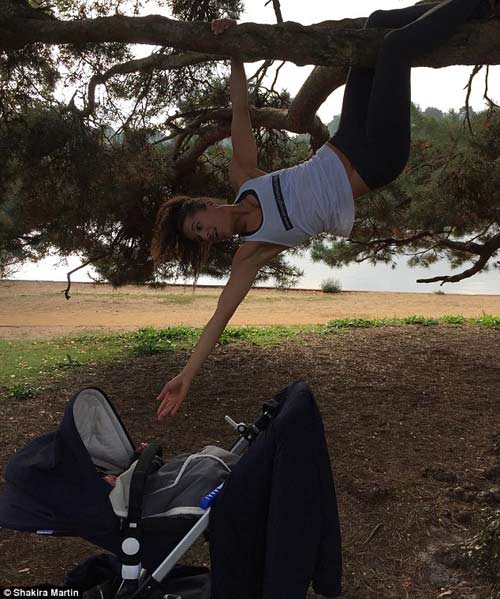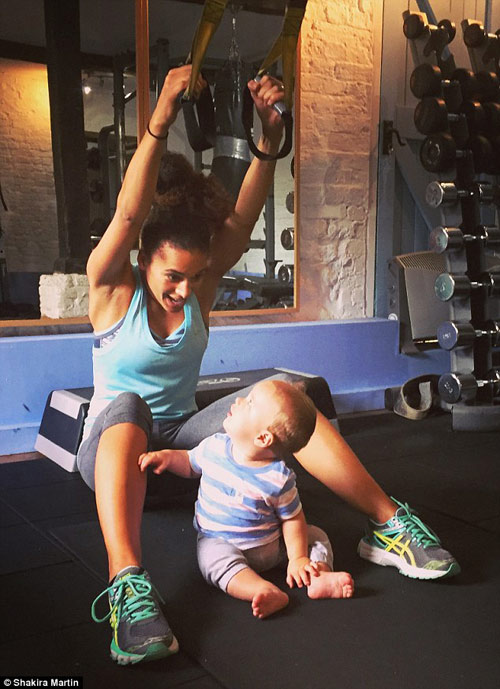 Cùng một lúc vừa chơi với con, vừa tập thể dục, đó là bí quyết giúp lấy lại vóc dáng thon gọn, săn chắc sau sinh của mẹ Shakira Akabusi.
