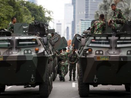 Quân đội Indonesia triển khai gần nơi xảy ra vụ tấn công khủng bố hôm 14.1 tại thủ đô Jakarta. IS được cho đã lên tiếng nhận trách nhiệm vụ này - Ảnh: Reuters