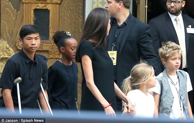 Trong sự kiện này, Angelina còn đem theo 5 nhóc tỳ đến dự gồm Pax Thiên, Zahara, Shiloh và cặp song sinh Vivienne – Knox. Riêng Pax Thiên phải chống nạng do tai nạn trong chuyến du lịch Thái Lan hồi đầu tháng 1. Dù vắng bóng ông xã Brad Pitt nhưng Angelina được nhóm vệ sĩ giúp cô trông nom lũ trẻ. 5 nhóc tỳ diện đồ đen và trắng ăn ý với mẹ, ngoan ngoãn nghe theo hướng dẫn của Angelina.