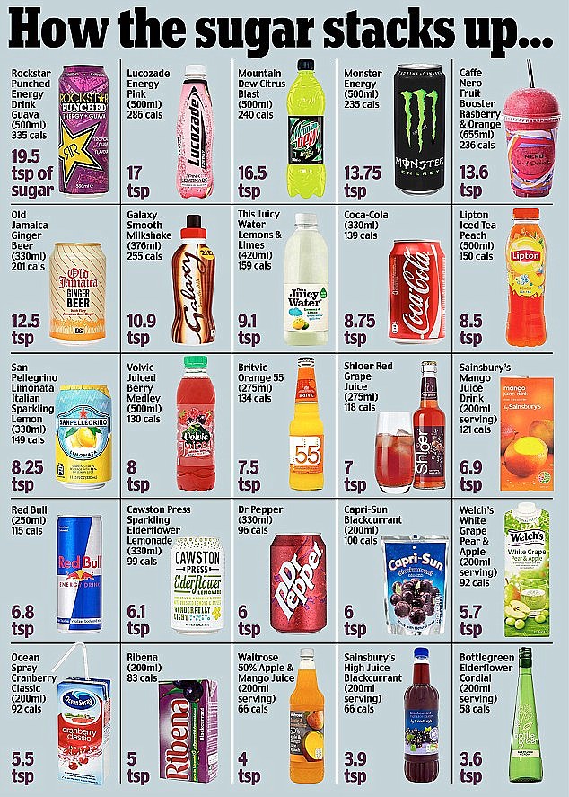 Lượng đường trong các loại đồ uống. Chỉ số tsp nghĩa là tương đương 1 thìa đường. Ảnh: Daily Mail.