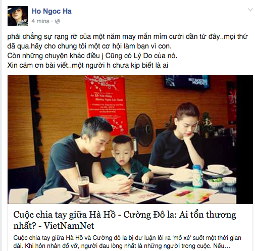 Mặc dù Hồ Ngọc Hà và doanh nhân Nguyễn Quốc Cường đã đường ai nấy đi khá lâu, nhưng đây vẫn là chủ đề khiến giới truyền thông tốn không ít giấy mực trong thời gian qua. Mới đây, trên trang Facebook riêng, cô thu hút nhiều sự chú ý khi chia sẻ đoạn trạng thái ngắn về tình cũ. Theo đó, nữ ca sĩ cho biết mọi thứ đã qua và mong mọi người hãy cho cả hai một cơ hội làm bạn vì con trai – bé Subeo.