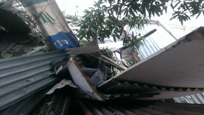 Khối bê tông lớn này đã rơi thẳng xuống mái ngôi nhà ở dưới. Ngay lâp tức mái nhà đã sập xuống với 2 người bên dưới. Rất may 2 người chỉ bị mắc kẹt và đã được đưa ran gay sau đó.