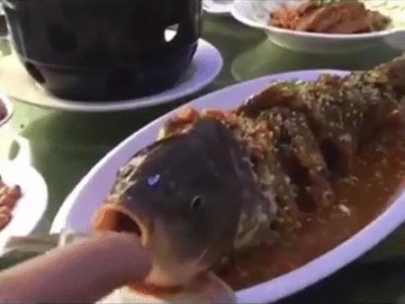 Theo trang mạng Dailymail của Anh, clip này được cho là quay ở Trung Quốc. Trong clip là một con cá chép lớn, được khía nhiều nhát cắt lớn và nhìn có vẻ đã được nấu chín phần thân.