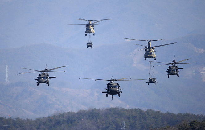 Trực thăng quân sự CH-47 và Black Hawk tham gia vào cuộc tập trận của quân đội Hàn Quốc và Mỹ ở Pocheon hồi tháng 3-2015 - Ảnh: Reuters