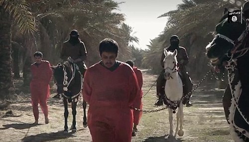 Hôm qua 14/3, IS tung một đoạn video dài 5 phút ghi lại cảnh hành quyết các tù nhân bị buộc tội gián điệp. Hình ảnh đầu tiên là các đao phủ cưỡi ngựa dắt theo 3 tù nhân.